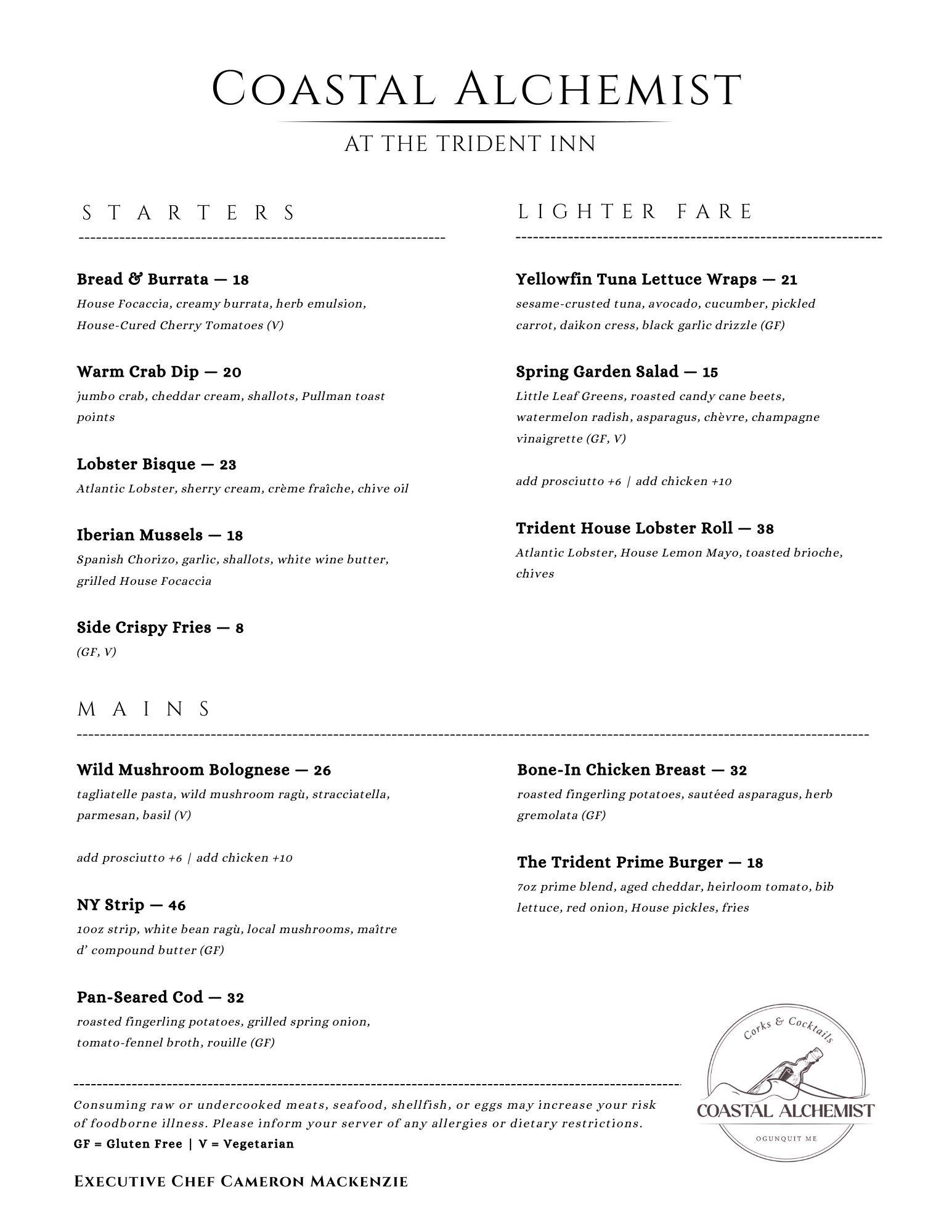 - Coastal Alchemist gift cards are valid for use at Coastal Alchemist only and cannot be applied toward lodging or room charges at The Trident Inn.