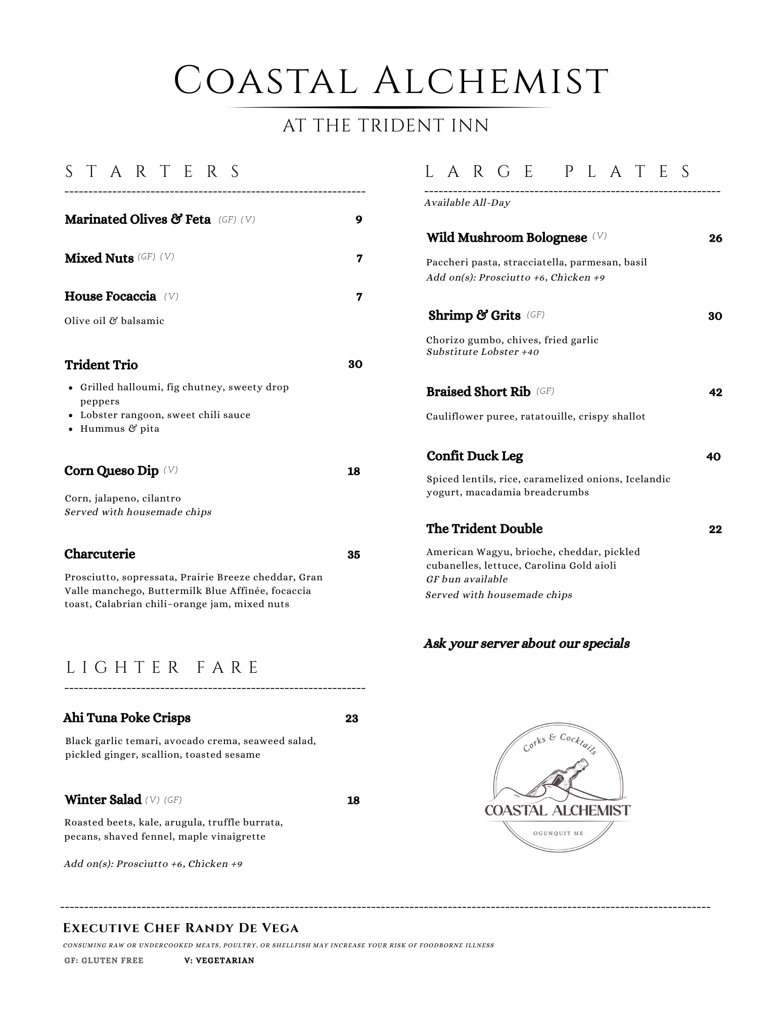 - Coastal Alchemist gift cards are valid for use at Coastal Alchemist only. They cannot be used toward lodging or room charges at The Trident Inn.
